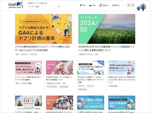 GA4をはじめとするデータ活用を学べる「トレーニング動画」や「ウェビナー動画」、GA4を体系的に学べる「GA4実戦ガイド」、GMPの最新情報をお届けする「プレミアムレター」などなど、GA4を体系的に学べるコンテンツが揃っています。自主学習コンテンツと謳ってはいますが、個人のスキルアップだけではなく、組織的なGA4活用にも役立つため、多くのお客様にご好評いただいております。